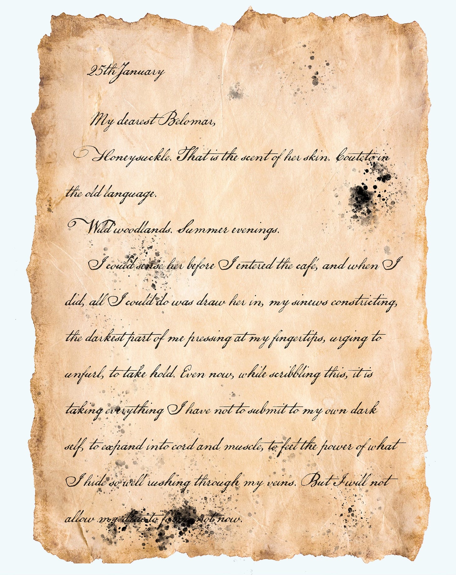 Which is why I’m writing to you, my old friend. Not because I’ll send this. Of course, I won’t. But because something cursed is stirring within, something that has caused me to already snap two quills as I scratch this out, though I barely know why. It is unnatural to me, unexpected, unruly.