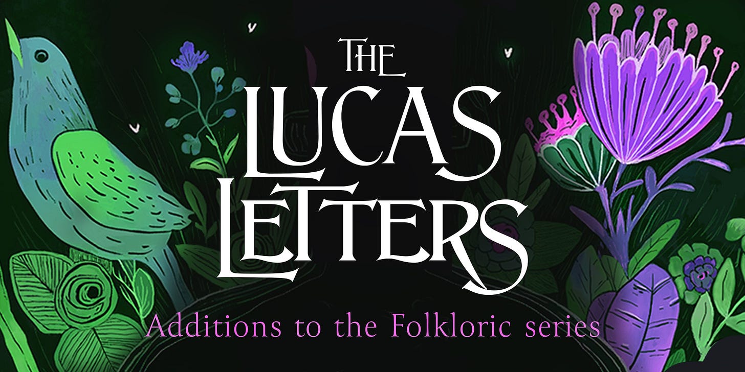 This is my way of giving you, lovely readers and newsletter subscribers, something extra—a little more of the Folkloric series once a month. The Lucas Letters are a sequence of communications between Lucas and various other people, written as he prepares to make contact with Camille, knowing she will be his partner as Keeper of the Bounds between the fae and human realms. They detail his side of things and feature exploits of his own, taking place in the period from before Folkloric Fae, the prequel, to the beginning of Folkloric, book one.